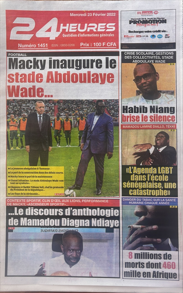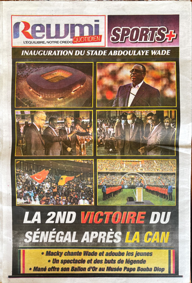 Bes-bi Le jour gazetesi, bir Türk şirket tarafından tamamlanan Senegal Stadyumu'nun açılışında, Cumhurbaşkanı Recep Tayyip Erdoğan'ın Senegalli mevkidaşı Macky Sall ile sahada başlangıç vuruşu yaptığı fotoğrafı manşetten verdi.