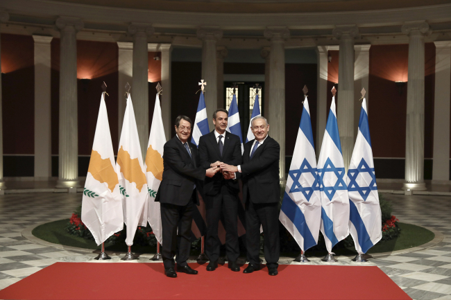 [Fotoğraf: AA | Yunanistan'ın başkenti Atina'da Güney Kıbrıs Rum Yönetimi (GKRY), Yunanistan ve İsrail arasında Eastmed (Doğu Akdeniz doğal gaz boru hattı) projesinin inşası için anlaşma imzalandı. İmza töreni öncesi dönemin İsrail Başbakanı Binyamin Netanyahu, Yunanistan Başbakanı Kiryakos Miçotakis ve Güney Kıbrıs Rum Yönetimi Lideri Nikos Anastasiadis kameralara poz verdi.]Yunanistan, bu konuda umutlarını ABD'ye bağlamıştı. Ancak Trump yönetiminin desteklediği projeye, Biden yönetiminin kapıları kapattığı ifade ediliyor.