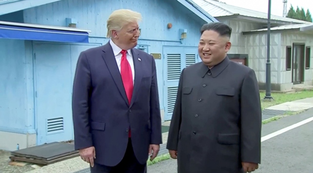 [Trump ve Kim, nükleer silah atışmasının ardından bir araya gelmişti. Fotoğraf: AA]2018’de önce Kuzey Kore lideri Kim Jong Un “Nükleer düğmenin her daim masasında olduğu” açıklamasına Trump, “Onun tükenmiş ve açlık çeken rejiminden birisi lütfen onu bilgilendirsin. Benim de nükleer düğmem var ama onunkinden çok daha büyük ve güçlü ve benim düğmem çalışıyor" cevabını verdi.
