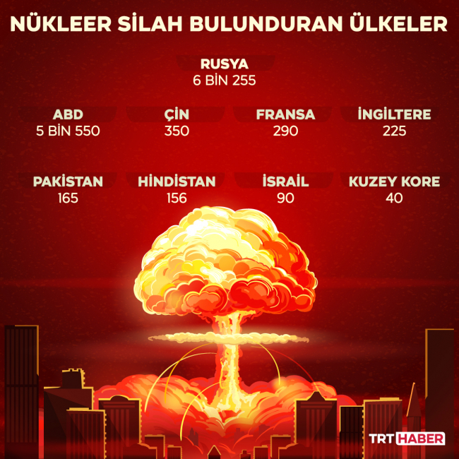 Dünyada bugün 13 bine yakın nükleer savaş başlığı bulunurken en çok savaş başlığı ABD ve Rusya’nın elinde bulunuyor. ABD 2. Dünya Savaşı sırasında ilk kez nükleer silaha başvurduğu 1945’te Japonya’nın Hiroşima ve Nagazaki kentlerine atom bombaları attı.