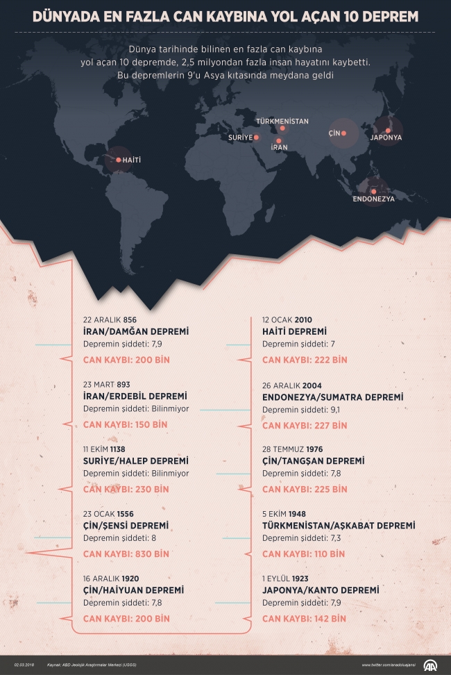 ABD Jeolojik Araştırmalar Merkezi (USGS) verilerine göre, en fazla can kaybına neden olan 10 depremden 9'u Asya kıtasında meydana geldi.