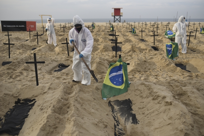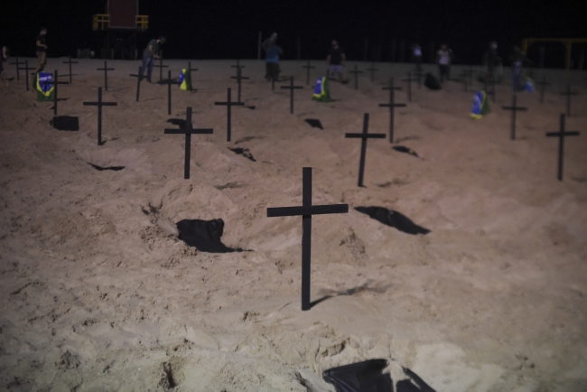 [Fotoğraf: AA]Brezilya'nın Rio de Janeiro şehrindeki ünlü Copacabana plajında, COVID-19 ölümlerini ve hükümetin salgın ile mücadele kapsamındaki politikalarını protesto etmek amacıyla göstericiler, başlarına siyah haç diktikleri 100 adet sembolik mezar kazdı.