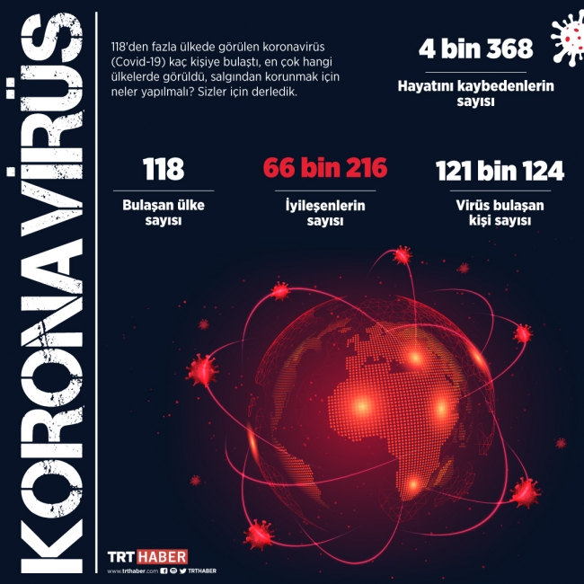 Yeni tip koronavirüs (Covid-19) salgınında vaka sayısı 120 bini, hayatını kaybedenlerin sayısı 4 bin 300'ü ve virüsün yayıldığı ülke sayısı 110'u geçti. İyileşenlerin sayısı ise 66 bin 216.