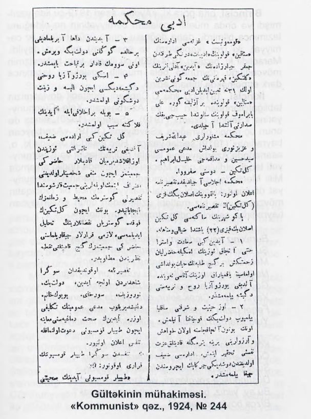 Azerbaycan’da edebi mahkemede yargılanan ilk karakter, C. Cabbarlı’nın Aydın piyesinin kadın kahramanı Gültekin oldu.