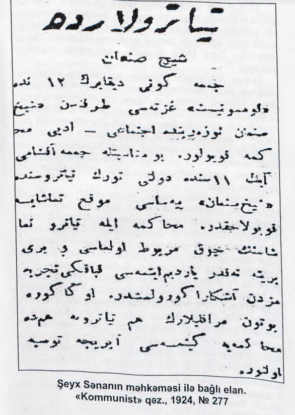 [Şeyh Senan'ın mahkemesi Kommunist gazetesinde | Prof. Dr. Cəlal Qasımov, Ədəbi Məhkəmələr sayfa: 65]Şeyh Senan ile ilgili edebi mahkemenin üyeleri ve görevleri “Yeni Yol” gazetesinin 15 Aralık 1924 tarihli sayısında şöyle belirtildi: