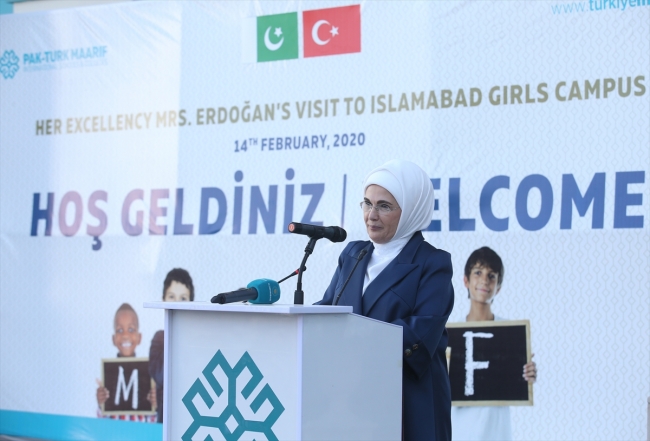 Cumhurbaşkanı Recep Tayyip Erdoğan'a eşlik etmek için Pakistan'da bulunan Emine Erdoğan, İslamabad'daki Faisal Maarif Okuluna gelişinde, Türkiye Maarif Vakfı Başkanı Birol Akgün ve okul yönetimi tarafından karşılandı.