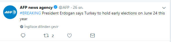Reuters haberi, "AK Parti ve MHP'nin seçime birlikte gireceğini hatırlatan Cumhurbaşkanı Erdoğan, seçimlerin 24 Haziran 2018'de gerçekleştirileceğini açıkladı" diye duyurdu.