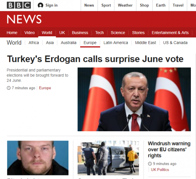 Erdoğan tarafından açıklanan erken seçim kararı için "sürpriz" yorumunu yapan BBC, seçimlerin Kasım 2019'dan 24 Haziran 2018'e çekildiğini duyurdu.