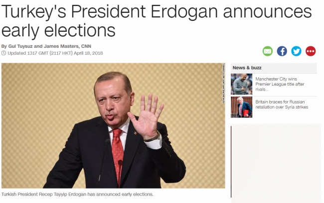 ABD merkezli CNN, sitesinden son dakika bandıyla verdiği haberi, "Erdoğan, Meclis ve Cumhurbaşkanlığı seçimlerini belirlenen tarihten 1 yıl öncesine aldı" şeklinde duyurdu.