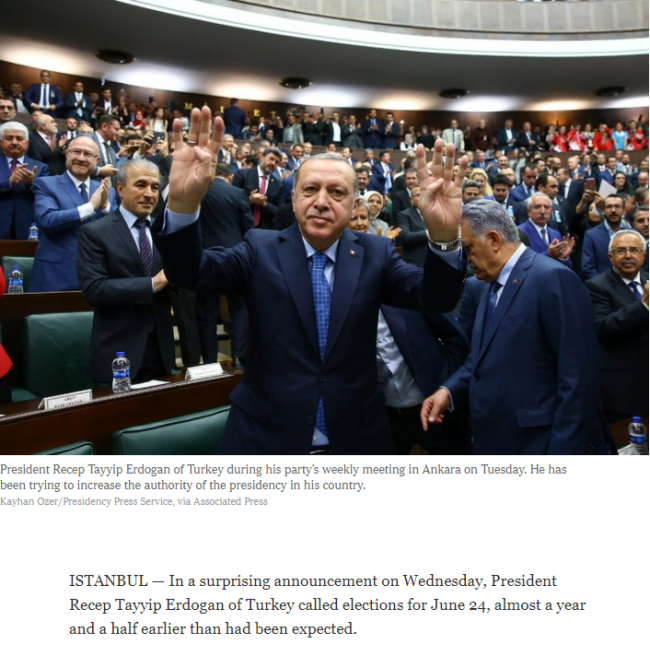New York Times, Erdoğan'ın açıklamasının "sürpriz" olduğunu söyleyerek, seçimin 1 yıldan daha fazla süreyle erkene alındığını yazdı.
