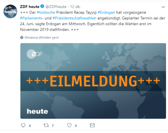 ZDF kanalı, Erdoğan'ın açıklamasını son dakika duyurdu. Erdoğan'ın seçim tarihini 24 Haziran'a aldığını aktaran ZDF, daha önceki tarihin Kasım 2019 olduğunu da hatırlattı.