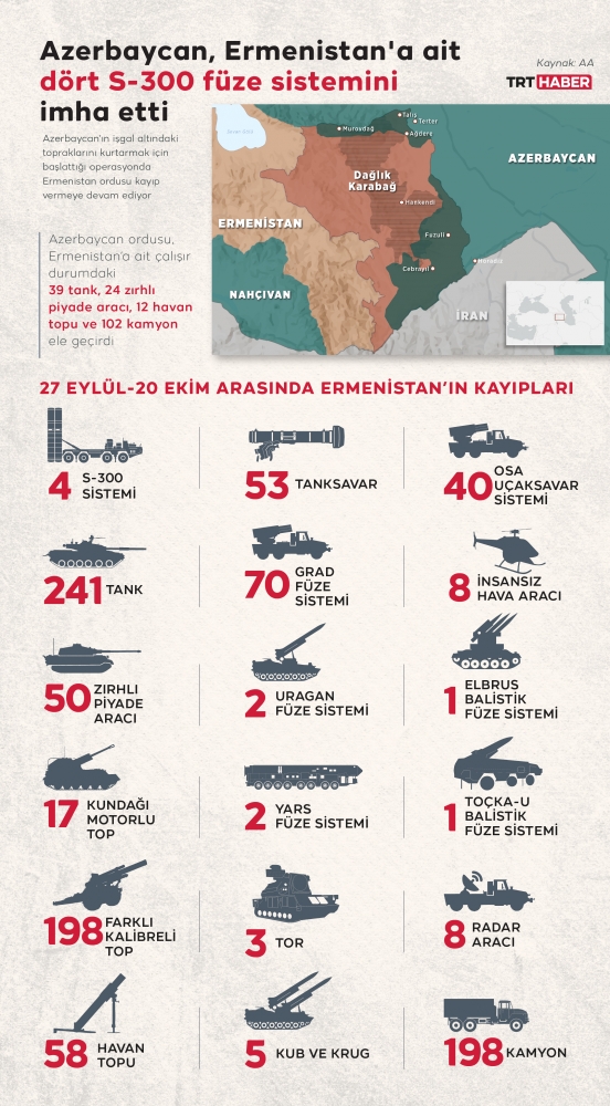 [Grafik: TRT Haber]Ermenistan ordusunda yaşanan ağır kayıplar nedeniyle halkı "cepheye çağıran" Paşinyan, "Bu nedenle, diplomatik bir çözüme ulaşılana kadar tüm vatandaşların ellerinde silahla savaşması gerekiyor. Dağlık Karabağ'daki tüm iş insanlarının ve öğrencilerin Dağlık Karabağ’a dönerek ordu hizmetine girmeleri gerekiyor." ifadesini kullandı.