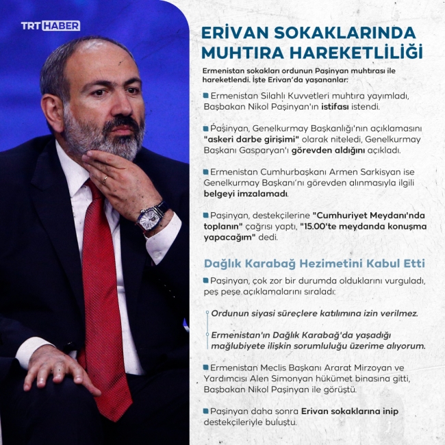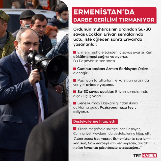 Destekçilerini sokağa çağıran Ermenistan Başbakanı Paşinyan, ordunun kendisine yönelik istifa çağrısını "darbe girişimi" olarak nitelendirdi; Genelkurmay Başkanı Onik Gasparyan’ı görevden aldığını duyurdu.