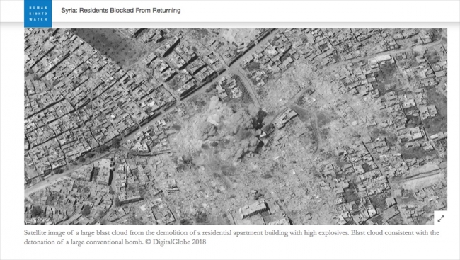 HRW açıklamasında, başkent Şam'ın Kabun mahallesinin uydu görüntülerini inceleyerek, rejimin mülkleri ihtarsız, tazminatsız ya da herhangi bir çözüm sunmadan yıktığını gözlemledikleri kaydedildi.