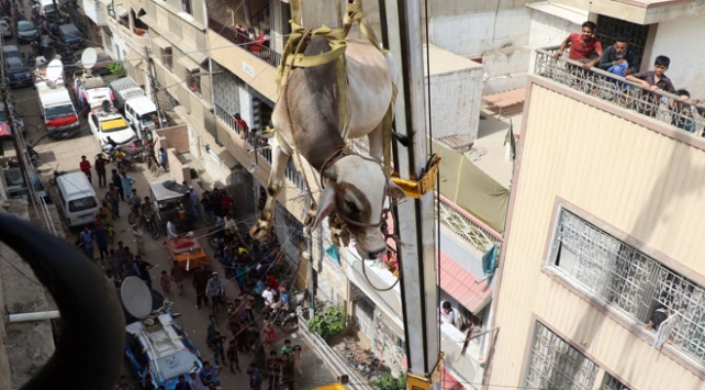 Pakistan'ın güneyi liman kenti Karaçi'de bir besici kurban bayramı öncesi evinin çatısında beslediği kurbanlıklarını vinç yardımı ile indirerek kurban pazarına götürüyor.