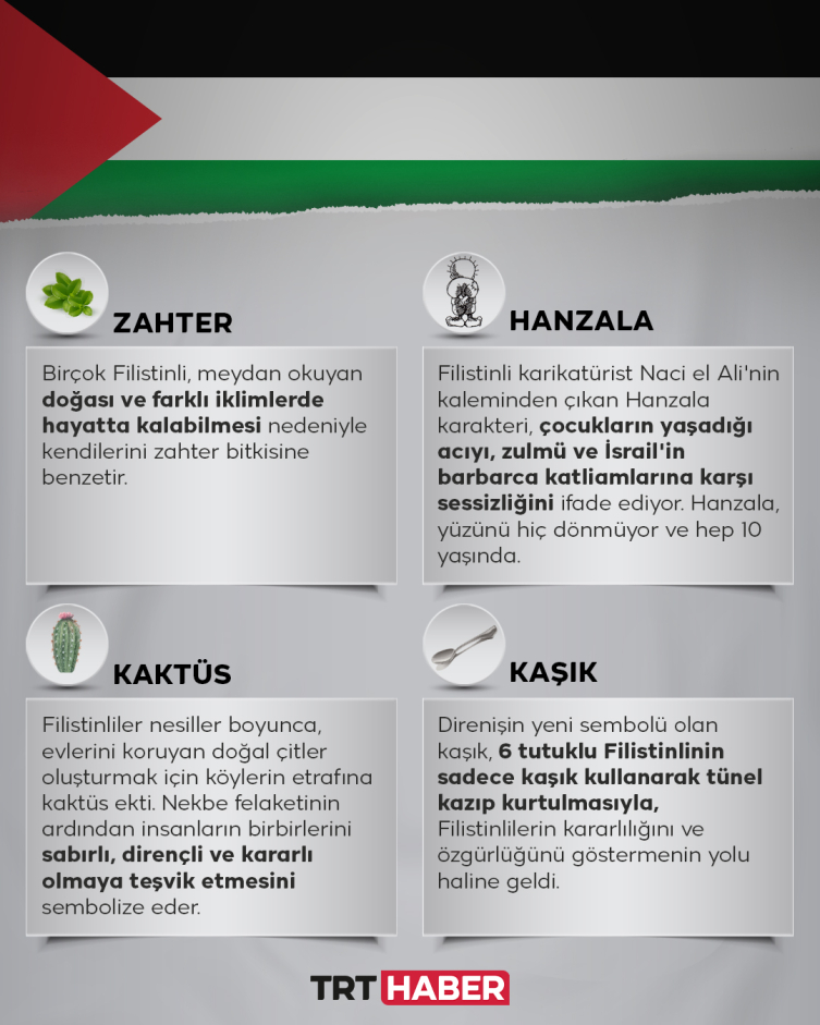 Nekbe'de ellerinden alınan portakal ağaçları, Filistin bayrağı yasaklandığında sembolleşen karpuz, evlerinden zorla çıkarılan halkın bir gün geri dönecekleri umuduyla yanlarından hiç ayırmadıkları anahtarlar, ayakları çıplak, elbisesi yamalı ve sırtı hep dönük, on yaşındaki "Hanzala" karakteri, Filistin'in özgürlük mücadelesinin sembollerinden bazıları.