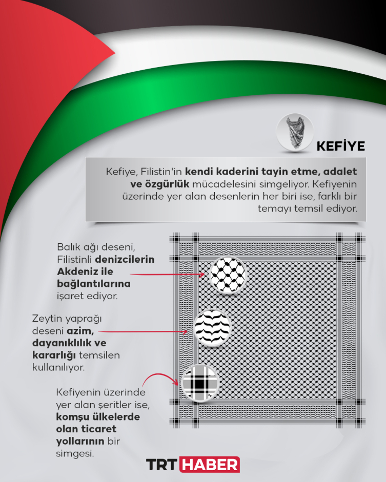 Kefiyenin üzerinde yer alan desenlerin her biri ise, farklı bir temayı temsil ediyor. Balık ağı deseni, Filistinli denizcilerin Akdeniz ile bağlantılarına işaret ediyor. Zeytin yaprağı deseni azim, dayanıklılık ve kararlığı temsilen kullanılıyor. Kefiyenin üzerinde yer alan şeritler ise, komşu ülkelerde olan ticaret yollarının bir simgesi.