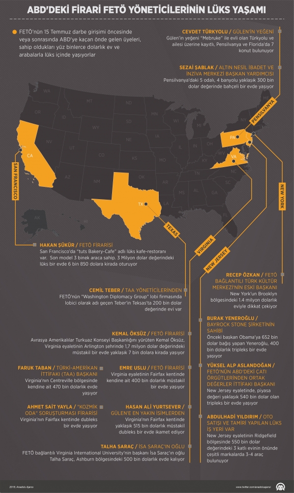 ABD'de kamuya açık kaynaklardan derlenen bilgiler, FETÖ'nün bu ülkede yaşayan önde gelen mensuplarının yüksek standartlara sahip konutlarda rahat içinde yaşadıklarını ortaya koydu.