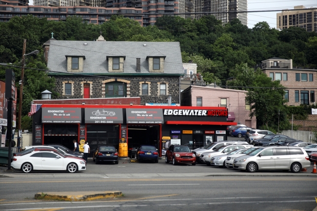 Hudson Nehri kenarındaki River Road Caddesi'nde bulunan Edgewater Motors adlı iş yerinin önünde çeşitli markalarda çok sayıda lüks otomobilin yer alması dikkati çekiyor.