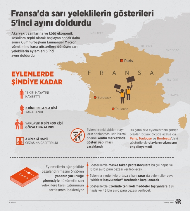 Fransız yetkilileri bu kararı almaya iten sarı yeleklilerin 16 Mart'ta Paris'in Champs-Elysees Caddesi'nde düzenlediği gösteri oldu. Bu gösteride polise taş ve şişe atan göstericiler, birkaç barikatı ateşe vermiş, birçok mağaza ve restoranı yağmalamıştı.
