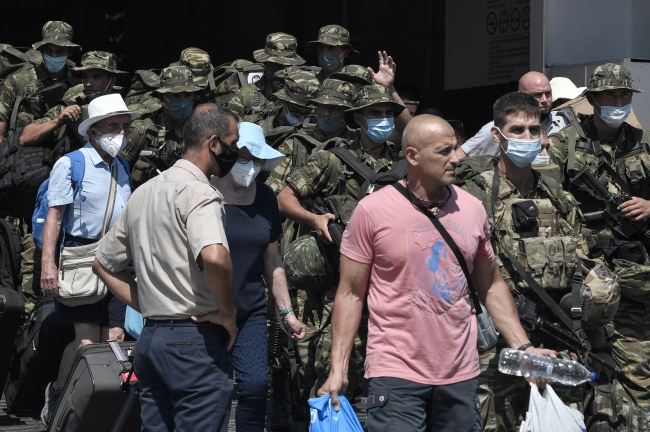 Ajans, kamuflajlı ve silahlı askerlerin Blue Star adlı gemiye bindikleri ve indikleri anlara dair fotoğrafları yayımladı.