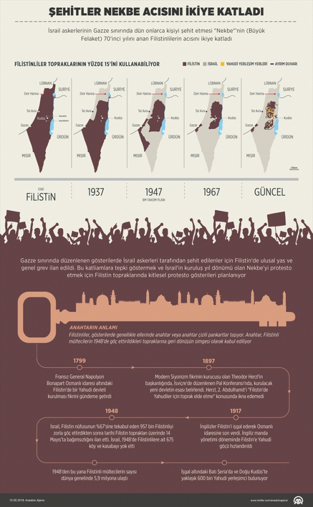 Filistin halkı, doğup büyüdükleri topraklarına 70 yıldır uzaktan bakıyor. İsrail'in işgalci tutumu yüzünden bugün dünyada yaklaşık 6 milyon Filistinli, vatanlarından uzak yaşıyor. Zorunlu göç, yağma ve katliamların simgesi "Nekbe", bugün 70'inci yılında.