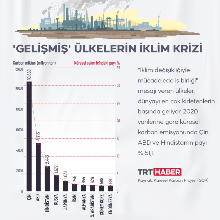 Küresel Karbon Projesi (GCP) verilerine göre, dünya genelinde toplam karbon salımı, 2020 yılında 34 milyar 810 milyon ton olarak gerçekleşirken bu emisyonun yüzde 51,1'i Çin, ABD ve Hindistan tarafından gerçekleştirildi.