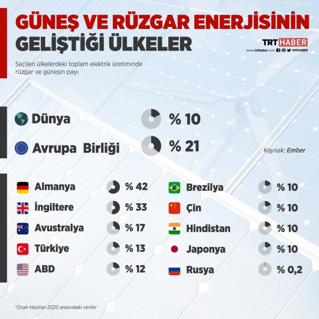 [Grafik: TRT Haber / Bedra Nur Aygün]Almanya’nın toplam elektrik üretiminde rüzgar ve güneş enerjisinin payı 2020’nin ocak-haziran ayları arasında yüzde 42 oldu. İngiltere için bu oran son yıllardaki atılımlarıyla yüzde 33. Türkiye de ilk 5’teki yerini yüzde 13 ile koruyor. Avrupa Birliği’nin (AB) oranı yüzde 21.
