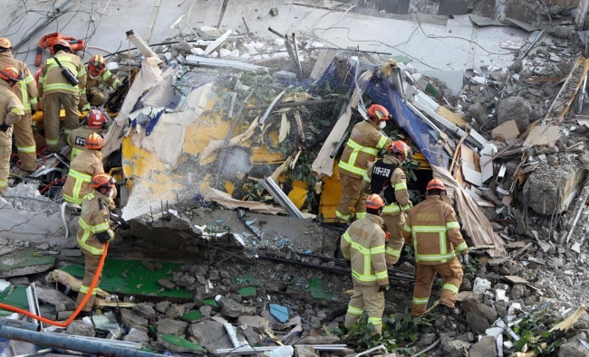 Güney Kore'nin güneyindeki Gwangju kentinde, kontrollü yıkım çalışması gerçekleştirilen 5 katlı bina, planlanan alana değil, önündeki yolda durakta bekleyen yolcu otobüsünün üzerine devrildi.