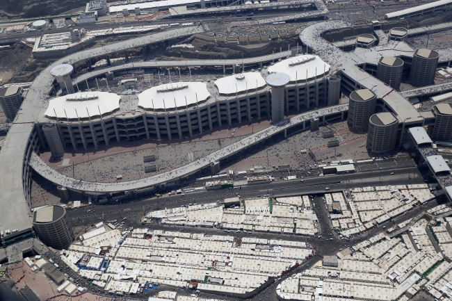 Şeytan taşlama görevini yapan hacılar ve Mina bölgesi havadan görüntülendi. Hacıların Mina'dan ve kaldıkları otelden Cemarat'a gelişlerinde yoğunluk yaşanmadığı görülüyor.