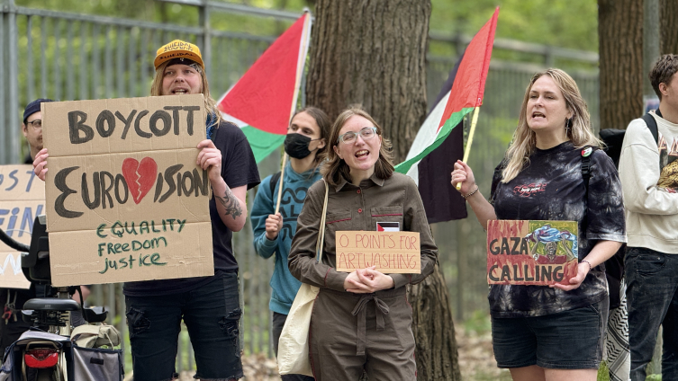 AVRO-TROS'un yarışmayı yayınlaması halinde, İsrail'in Gazze'de yaptığı soykırıma ortak olacağını belirten göstericiler, Eurovision, AVRO-TROS ve İsrail aleyhine sloganlar attı.