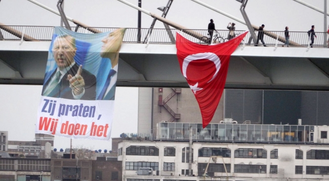 Öte yandan Rotterdam kentinde bulunan Erasmus Köprüsü'ne Türk bayrağı ve Cumhurbaşkanı Erdoğan’ın resminin bulunduğu “Onlar konuşur biz yaparız” yazılı afiş asıldı. Bayrak kısa sürede polis tarafından kaldırıldı.