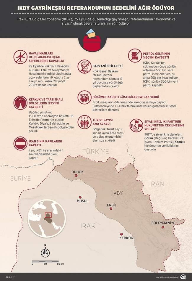 Erbil yönetimi, Birleşmiş Milletler (BM) başta olmak üzere ABD, İngiltere, Almanya ve uluslararası toplumun iptal çağrılarını dikkate almaksızın, 25 Eylül'de gayrimeşru referandumu gerçekleştirdi. Referandumun ardından büyük bir kriz içine giren Erbil yönetimi, telafisi uzun zaman alacak ciddi kan kaybı yaşıyor.