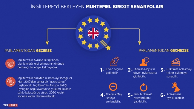 Parlamento oylamasına bir gün kala May'in aldığı bu kararın ortaya çıkardığı seçenekler arasında, Brexit'e anlaşmasız geçiş, son dakikada yeni bir anlaşmaya varılması ya da İngiltere'de yeni bir referandum ihtimalleri var.