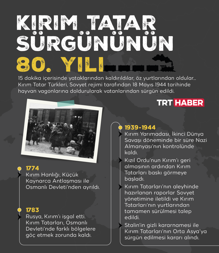 Kırım Tatar Türkleri, Sovyetler Birliği'nin lideri Josef Stalin'in kararıyla, 18 Mayıs gecesi 15 dakikada öz yurtlarından koparılarak insanlık dışı şartlardaki tren vagonlarıyla Orta Asya'ya sürgün edildi.