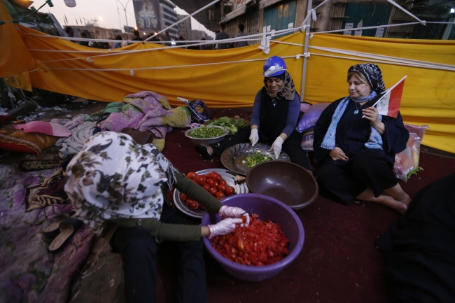 Gösterilerin merkezi konumundaki Tahrir Meydanı'nda kadınlar, yemek yaparak, çamaşır yıkayarak ve tıbbi müdahalede bulunarak göstericilere destek veriyor.