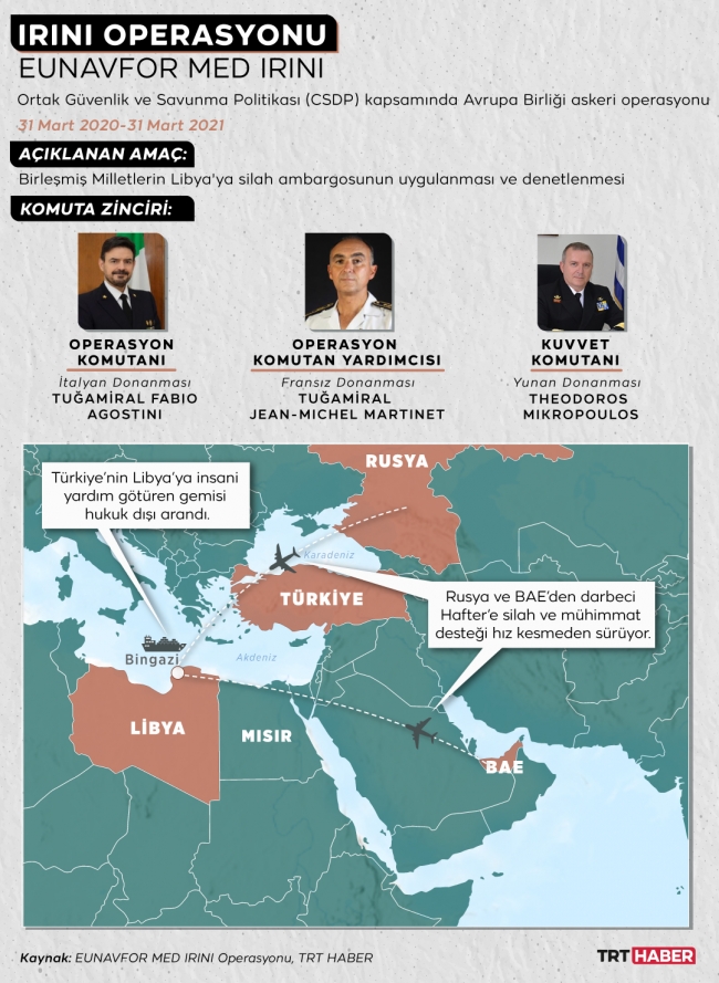 Almanya’nın, operasyonun ocak ayındaki Berlin Konferansı'nda katılımcı ülkelerin mutabık kaldığı ve BM'nin Libya'ya silah ambargosunun uygulanmasını hedeflediğini savunduğunu da belirtelim.