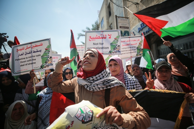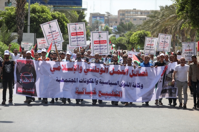 Filistinli grupların çağrısı üzerine "Normalleşme ihanettir" sloganıyla düzenlenen yürüyüşe katılanlar, Filistin bayraklarının yanı sıra normalleşmenin kınanması ve reddedilmesine yönelik dövizler taşıdı.
