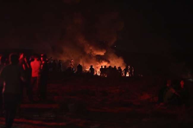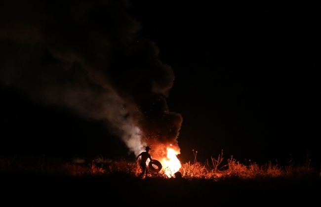 Kendilerine "gece kargaşa timi" adını veren Filistinli gençler, Gazze'nin doğu sınırında araç lastiği yaktı ve sınırdaki tellerin olduğu alana ses bombası attı.