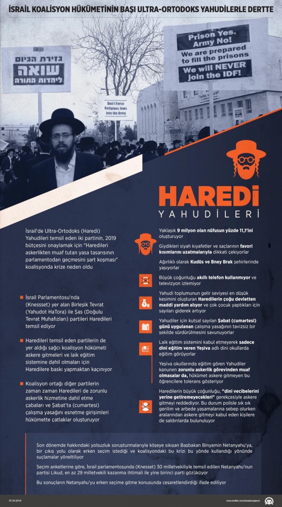 İsrail'de giydikleri siyah kıyafetler ve saçlarının favori kısımlarını uzatmalarıyla dikkat çeken Ultra-Ortodoks (Haredi) Yahudileri temsil eden iki partinin, 2019 bütçesini onaylamak için "Haredileri askerlikten muaf tutan yasa tasarısının parlamentodan geçmesini şart koşması" koalisyonda krize neden oldu.