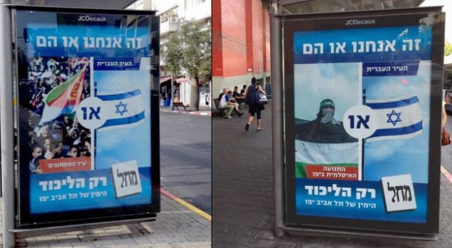 İsrail Başbakanı Binyamin Netanyahu'nun partisi Likud, 30 Ekim'de yapılacak yerel seçimler için hazırlanan propaganda afişlerinin birinde, iki ayrı görsel kullanmıştı. Görsellerden birinde, elinde Filistin bayrağı olan bir Müslüman, “Yafa (Tel Aviv) İslami Hareketi” yazısı altında gösterilmişti. Afişin diğer görselinde ise, İsrail bayrağının yanında Tel Aviv-Yafa “İbranilerin başkenti” yazısı kullanıldı. Afişte ayrıca, “Tel Aviv sadece Likud’un hakkı” ibaresi yer almıştı.
