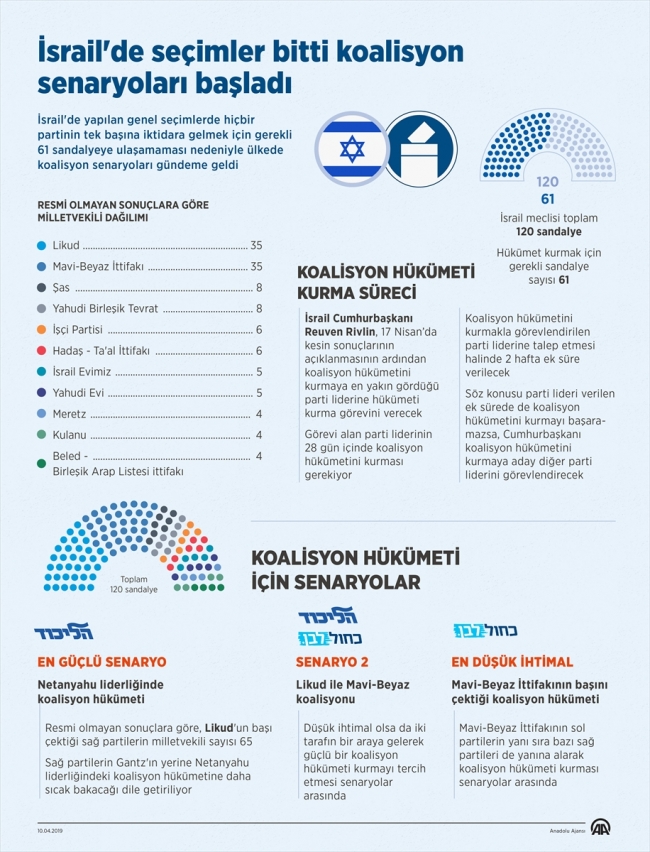Ancak Likud veya Mavi-Beyaz İttifakı kendi aralarında anlaşamayıp diğer partilerle koalisyon kurmayı tercih ederse kurulacak hükümetin en az 6 partiden oluşması bekleniyor.