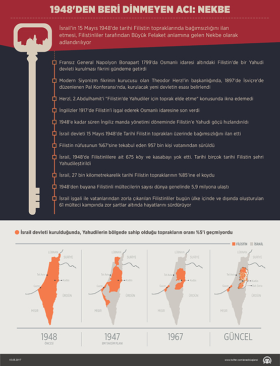 İsrail'in 15 Mayıs 1948'de tarihi Filistin topraklarında bağımsızlığını ilan etmesi, Filistinliler için onlarca yıldır devam eden felaketler silsilesinin başlangıcı oldu.