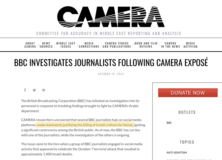 BBC'nin gazetecilerini soruşturmaya sevk etme kararı, CAMERA tarafından sunulan ve web sitesinde BBC gazetecilerinin "Sosyal medyada İsrailli sivillerin öldürülmesini meşrulaştıran açıklamalarda bulunduklarını" belirten bir raporun ardından geldi.