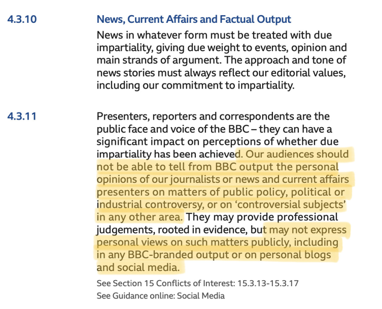 6 gazetecinin gönderilerine ilişkin soruşturma, yayın yönergelerinin 4.3.10, 4.3.11 ve 4.3.30 paragraflarına dayanıyor; bu paragraflar, kanal ekibinin, sunucularının ve haber muhabirlerinin bu gönderiler hakkında kişisel görüş sunmalarının veya yazmalarının uygunsuz olduğunu belirtiyor.