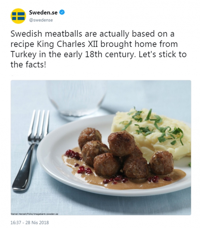 İsveç Devleti'nin resmi Twitter hesabı "Sweden.se"den yapılan paylaşımda, köfte fotoğrafı kullanılarak, ''İsveç köfteleri, aslında Kral 12. Charles'ın Türkiye'den eve getirdiği tarife dayanıyor. Gerçeklere bağlı kalalım.” ifadeleri kullanıldı.