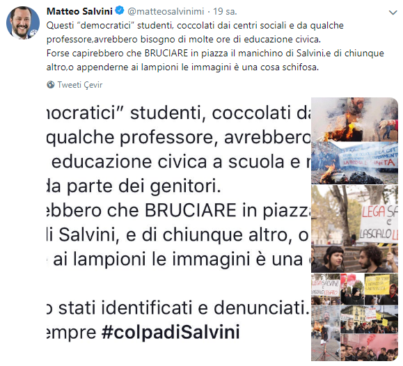 İçişleri Bakanı Salvini, resmi Twitter hesabı üzerinden protestolara sert tepki gösterdi. Tepkilerin ve sokak lambasına asılan fotoğraflarının yakılmasının "iğrenç" olduğunu söyleyen Salvini, “Sosyal merkezlerin ve bazı profesörlerin de gösterilerine katıldığı bu 'demokratik' öğrencilerin, saatlerce yurttaşlık eğitimi alması gerekir" dedi.