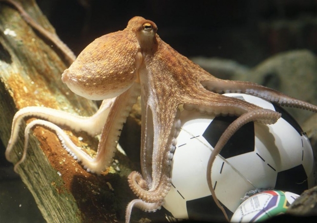Kahin ahtapot Paul, üzerinde ülke bayrakları ve içinde yemek olan kutulardan birine yönelerek tahminler yapıyordu.