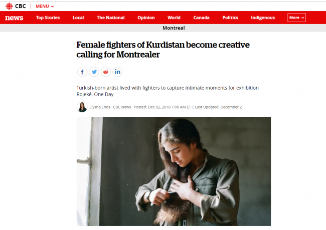 CBC, Kanada'nın Montreal kentinde yaşayan Kürt asıllı fotoğrafçı ve film yönetmeni Zayne Akyol'un PKK mensubu terörist kadınların Kandil Dağı'ndaki yaşantılarını anlatan, Espace Mile End Galerisi'nde 22 Kasım'da açılan ve 20 fotoğraftan oluşan "Rojeke (Bir Gün)" isimli sergisinin haberini yaptı.