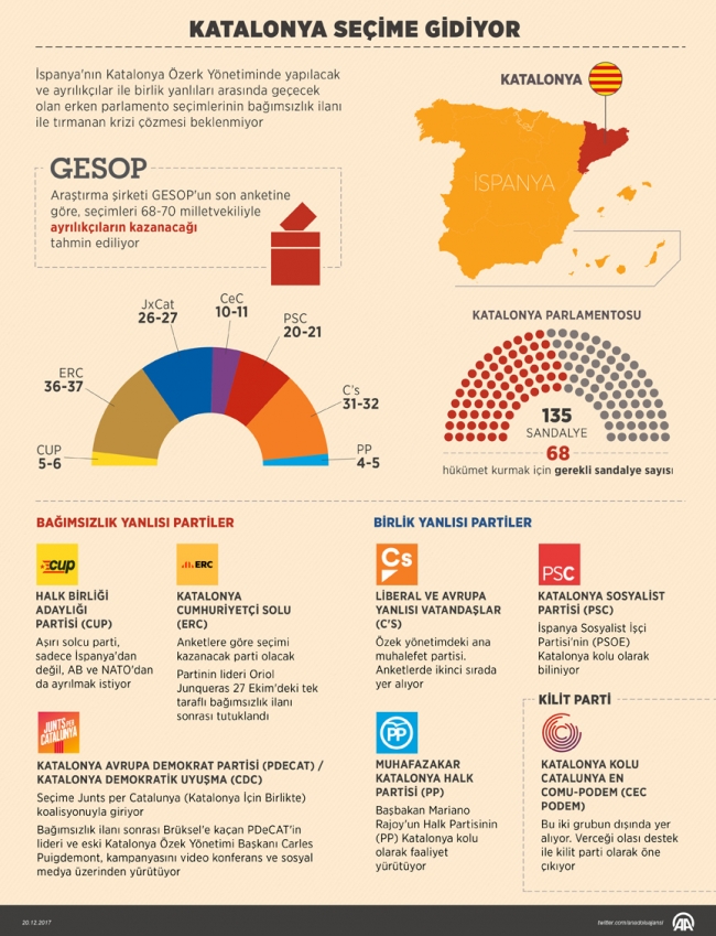 Birlik yanlıları ise Vatandaşlar (C's), Katalonya Sosyalist Partisi (PSC) ve Katalonya Halk Partisi (PPC) olarak öne çıkıyor. Özellikle Vatandaşlar'ın (C's) 36 yaşındaki kadın lideri Ines Arrimadas seçimin "parlayan yıldızı" olarak niteleniyor.